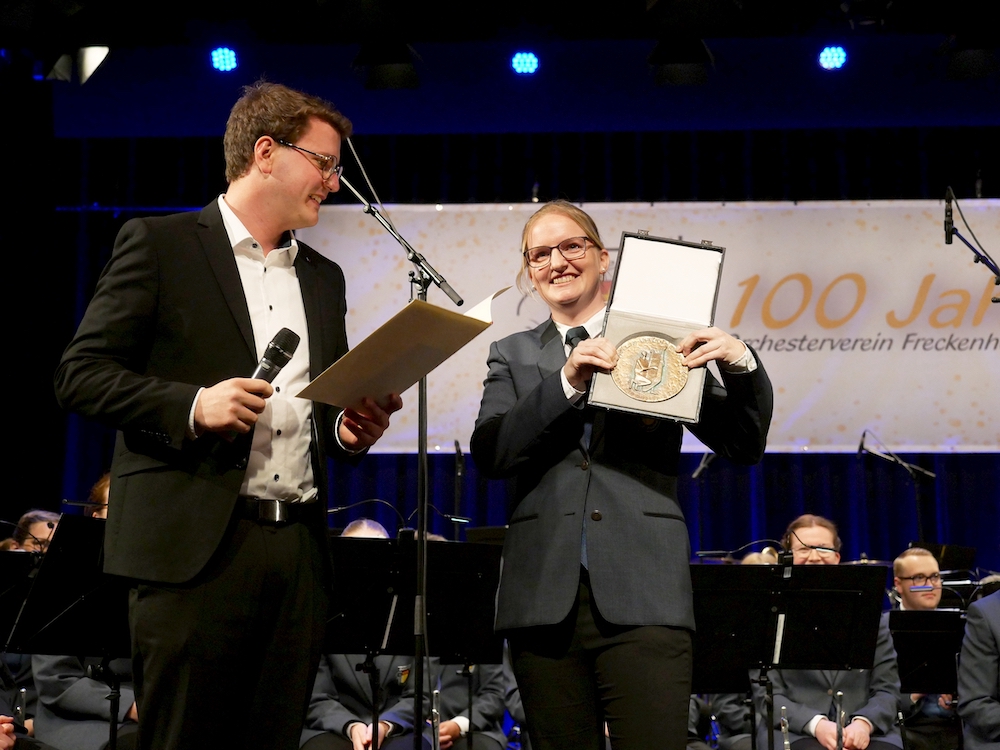 Im Rahmen der Veranstaltung überreichte Warendorfs stellvertretender Bürgermeister Johannes Austermann überreichte der Ersten Vorsitzenden des Vereins, Theresa Bröckelmann, im Namen von Bundespräsident Frank-Walter Steinmeier die begehrte Pro-Musica Plakette, die höchste Auszeichnung für instrumentales Musizieren die ein Amateurmusikverein in Deutschland erhalten kann.