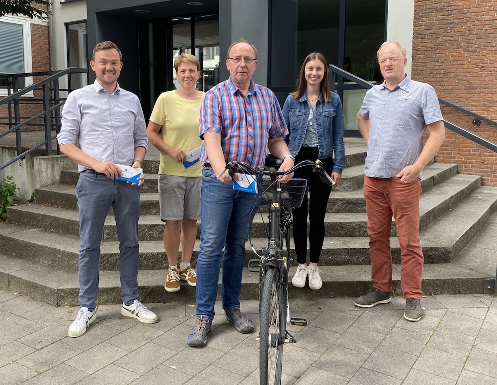 Auf dem Foto sind (von links): Bürgermeister Peter Horstmann, Petra Mester, Johannes Hellweg und die Stadtradeln-Koordinatoren der Stadt Lea Licher und Paul Hartmann. Es fehlt: Selmar Ibrahimovic.