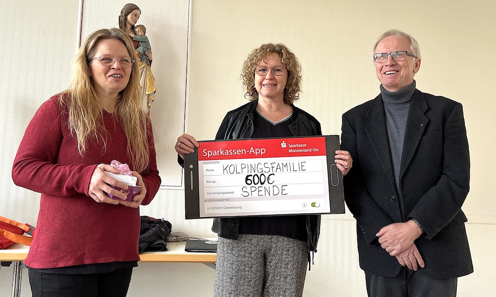 Eine Spendenübergabe erfolgte beim 173. Stiftungsfest der Kolpingsfamilie Warendorf an die Warendorfer Pfadfindergemeinschaft von Susanne Korte (links) und Manfred Wagner (rechts, beide Kolpingsfamilie) an Katharina Erpenbeck.