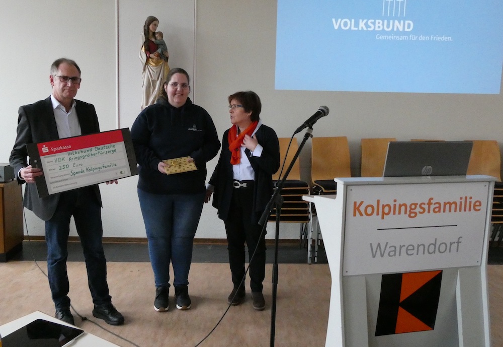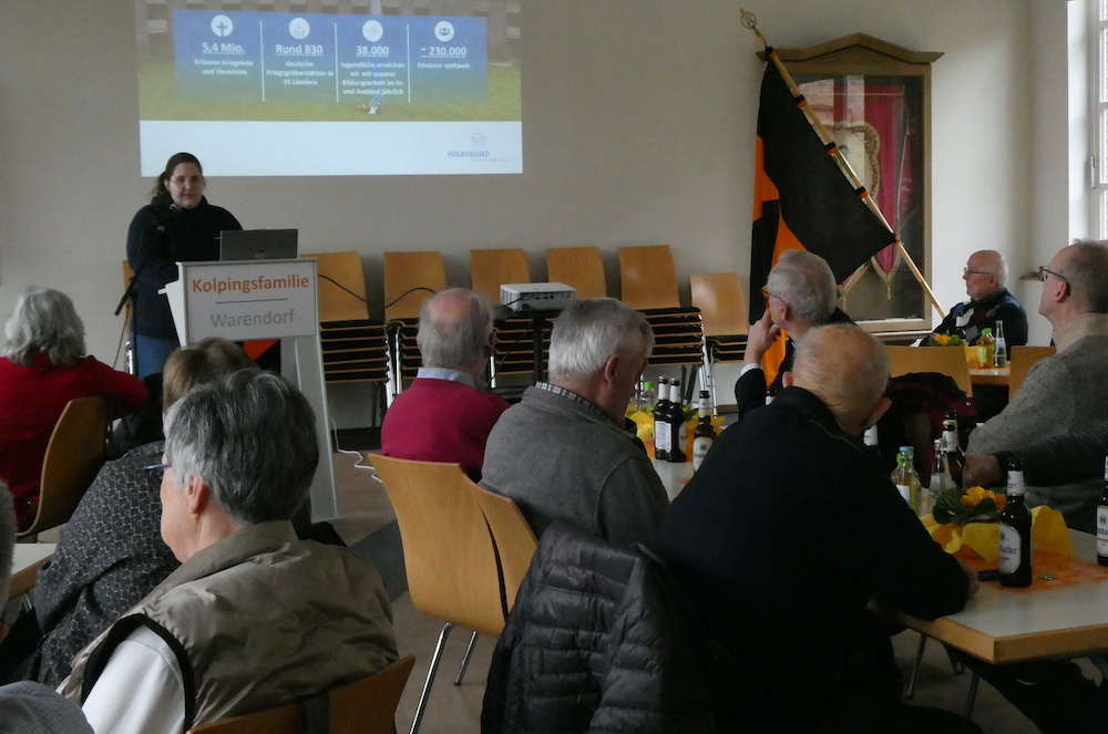 Als besonderen Gast begrüßte sie an diesen Morgen Imke Scholle. Sie berichtete mit großer Leidenschaft über ihre bereits über 15 Jährige Tätigkeit beim Volksbund Deutsche Kriegsgräberfürsorge. Der Volksbund pflegt viele Kriegsgräber, so auch noch bis 2014 auf der Krim. Durch die russische Besetzung ist das nicht mehr möglich. Insgesamt gibt es rund 830 deutsche Kriegsgräberstätten in 45 Ländern. 5,4 Millionen Kriegstote und Vermisste sind erfasst. Auch auf dem Warendorfer Friedhof gibt es 131 Kriegstote, polnische und auch sowjetische. Der Deutsche Volksbund erreicht mit seiner Bildungsarbeit jährlich etwa 38000 Jugendliche im In- und Ausland. Er ist der einzige Kriegsgräberdienst der Welt mit schulischer und außerschulischer Jugendarbeit. Drei eigene Bildungsstätten sind in Ysselsteyn in den Niederlanden, in Niederbronn in Frankreich und auf dem Golm in Deutschland. Bei Workcamps in ganz Europa findet mit der praktischen Pflege von Kriegsgräbern auch inhaltlich eine Auseinandersetzung zum Erinnerungsort statt. An die Opfer von Krieg und Gewaltherrschaft wird seit 1922 am Volkstrauertag gedacht, so auch in Warendorf und an vielen anderen Orten. Die Zentrale Gedenkstunde veranstaltet der Volksbund im Plenarsaal des Bundestages.
