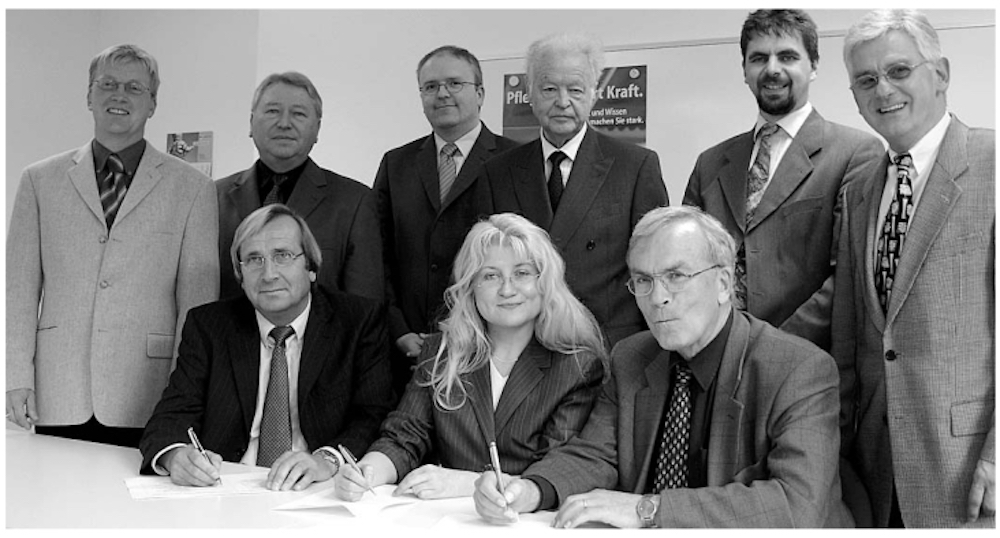 2003 traten die Städtischen Kliniken Bielefeld und die Stiftung Krankenhaus Halle als weitere Gesellschafter bei der ZAB GmbH ein. Vorn, v. l.: Volker Schulz (Krankenhaus Halle), Helga Schuhmann-Wessolek (Landschaftsverband Westfalen Lippe) und Dr. Johannes Kramer (Städtische Kliniken Bielefeld) bei der Unterzeichnung des Gesellschaftervertrags. Hinten, v. l.: Andreas Westerfellhaus, Hans-Dieter Samson, Dr. Stephan Pantenburg, Rudolf Wixforth, Andras Latz und Harald Geier. (Foto: Herold)