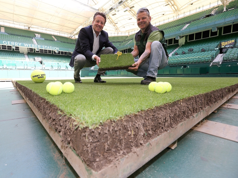 „Der Rasen ist in einem hervorragenden Zustand“, sagt Turnierdirektor Ralf Weber, pünktlich zum Turnierjubiläum. Wir sind auch dieses Jahr nah an dem Rasen von Wimbledon und können den Spielern die optimale Vorbereitung bieten.“ Greenkeeper Phil Thorn, der mit seinem Team die herausragende Qualität des Herzstücks der GERRY WEBER OPEN gärtnerisch hegt und pflegt, meint: „Der Rasen ist super.“ Derzeit werden 400 einzelne große Rasenstücke – jedes Stück hat ein Gewicht von 800 Kilogramm in der Abmessung 2 Meter x 1 Meter – per Gabelstapler in das GERRY WEBER STADION gefahren und zum 800 Quadratmeter großen Centre Court zusammengesetzt.