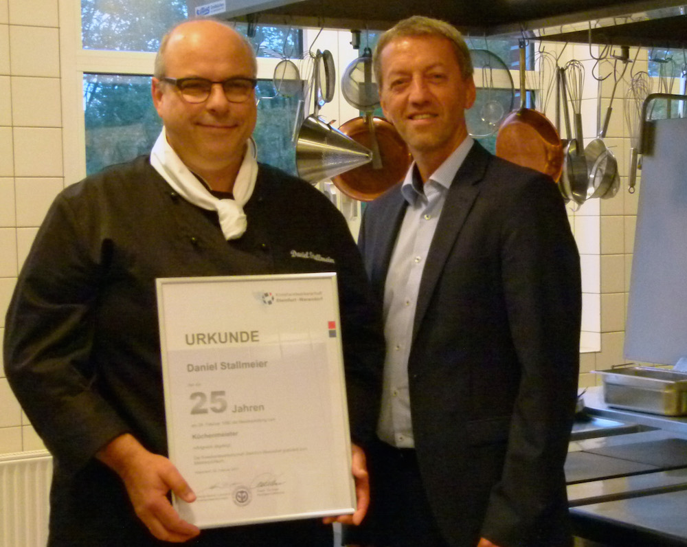 Zu seinem 25jährigen Meisterjubiläum gratulierte KH-Geschäftsführer Günter Schrade (re.) Küchenmeister Daniel Stallmeier (li.).