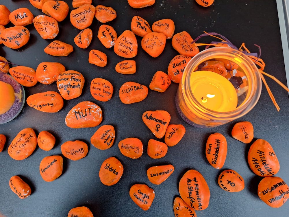 Trotz der Kälte blieben viele Passant*innen stehen, um sich über das Thema zu informieren. Auch die, von den Mitarbeiterinnen* vorbereiteten orangenen Steine mit Botschaften wurden von vielen Passant*innen mitgenommen und in der Stadt verteilt. Damit sollen Zeichen gesetzt werden, um weiter an Frauen* und Kinder zu erinnern, die von patriarchaler Gewalt betroffen sind.