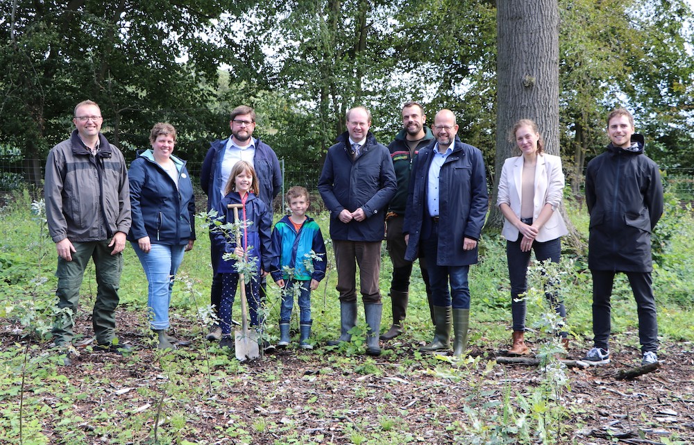 Freuen sich über die 7.500 Setzlinge: v.l. Norbert Groll, Manuela Groll, André Hackelbusch (Leiter Amt für Umweltschutz und Straßenbau), Karina und Lukas Groll, Landrat Dr. Olaf Gericke, Revierförster Jochen Garbe, Umweltdezernent Dr. Herbert Bleicher, Lea Hilling und Jonathan Kuban (Klimaschutzmanagement des Kreises). – Foto: Kreis Warendorf