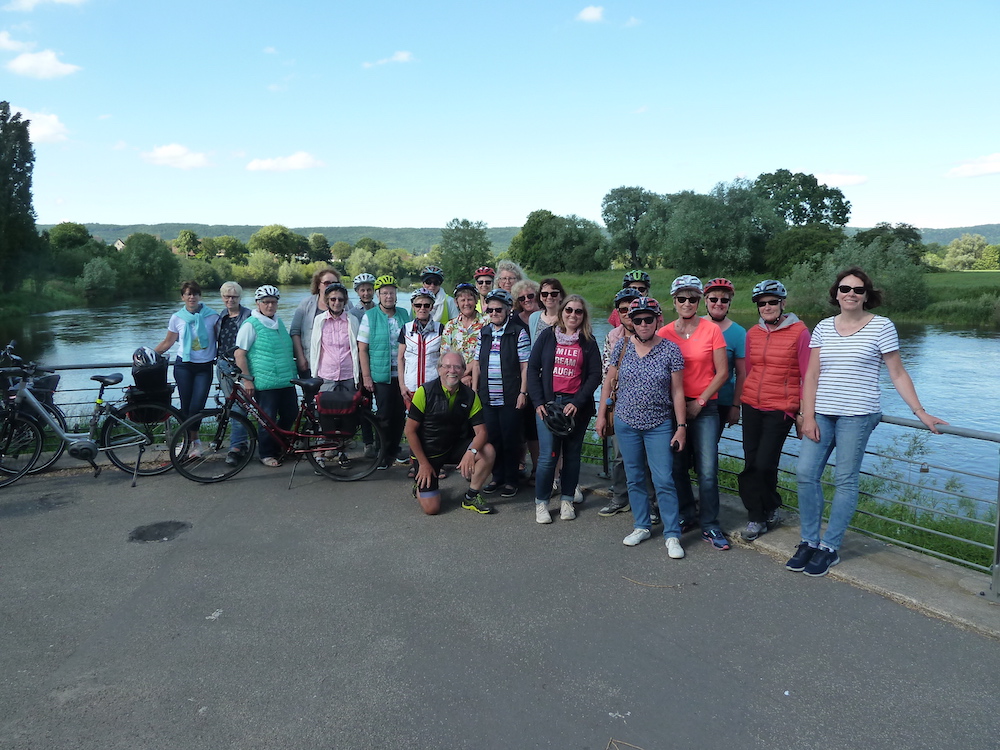 Die diesjährige Fahrradtour beträgt 53 km und führt die Frauen zu den drei Flüssen die Else ,die Werre , und die Weser. Am Samstagmorgen wurde der Anhänger des Busses mit den Fahrrädern beladen. Los ging es bei herrlichem Wetter nach Bünde. Von da aus ging es für 23 Frauen unter der Reiseleitung von Herrn Hilgenböcker mit den Rädern los. Am „Weserkuss“wurde die Gruppe mit der Fähre „Amanda „ übergesetzt. Dann ging es mit nahem Blick auf das Kaiser -Wilhelm -Denkmal nach Minden und auf der anderen Seite der Weser auf schönen Wegen zurück. Es waren sich alle einig es war eine wunderschöne Tour.