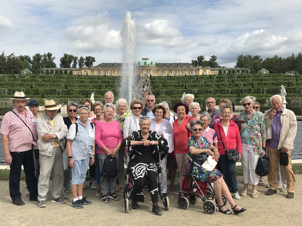 Das Foto zeigt die Gruppe vor der großen Fontäne von Schloss Sanssoussi.