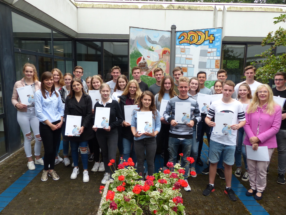 Nie zuvor erwarben so viele Schülerinnen und Schüler der Q1 im Rahmen ihrer Teilnahme am Projektkurs das IHK-Sprachzertifikat, das sie am Ende des Schuljahres glücklich und mit berechtigtem Stolz entgegennehmen durften. Ebenso stolz beglückwünschten die Schulleiterin Marlis Ermer sowie die Englischlehrerinnen Ursula Petry und Jennifer Stella ihre Schützlinge zu ihrem Erfolg.