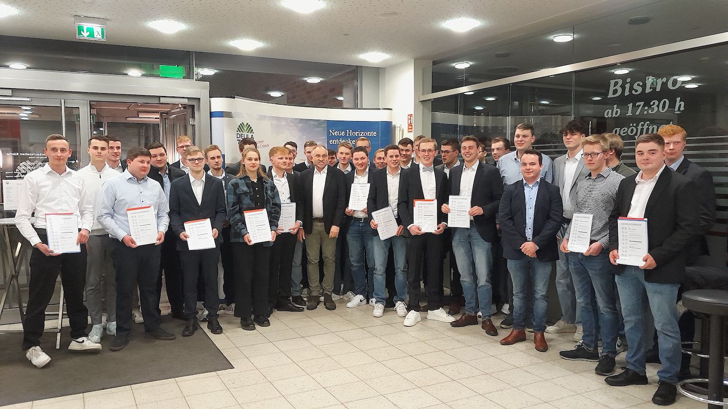 Als Innungsbesten konnte der Obermeister Julian Göckenjan (Ausbildungsbetrieb Greving Landtechnik GmbH Greven) auszeichnen, ihre Gesellenbriefe konnten Florian Baune (Anton Terörde e. K. / Inh. Dieter Terörde, Warendorf), Julian Bernöhle (Uennigmann Landmaschinen-Metallver. GmbH, Everswinkel), Simon Brinkmann (Deppe & Stücker GmbH, Beckum), Louis Büscher (Altefrohne Tiefbau GmbH & Co. KG, Warendorf), Ciwan Cetin (Heinrich Steingrobe e.K., Ochtrup), Henry Farwick (Poggemann GmbH, Bad Iburg), Björn Flüggen (Karl Pollmann GmbH, Beckum), Nora Geerds (Uennigmann Landmaschinen-Metallver. GmbH, Everswinkel), Lucas Griese (Ralf Menebröcker, Lengerich), Simon Große Hundrup (Stapel GmbH, Sendenhorst), Christoph Große-Bockhorn (AGRAVIS Technik Saltenbrock GmbH, Beelen), Joel Paul Gutmann (Karl Pollmann GmbH, Beckum), Felix Haasken (Jasper Land- und Erntetechnik GmbH, Hopsten), Ben Heemann (AGRAVIS Technik BvL GmbH, Ladbergen), Luca Kröner (AGRAVIS Technik BvL GmbH, Ladbergen), Lion Licher (Reckers GmbH & Co. KG, Ostbevern), Henri Liedmeier (Benedikt Kordel GmbH & Co. KG, Greven), Marco Lohmann (AGRAVIS Technik Lenne-Lippe GmbH, Warendorf), Max Lütke-Siestrup (B. Strautmann & Söhne GmbH & Co. KG, Bad Laer), Frederik Meyer (Gerdemann J. GmbH & Co. KG, Greven), Jonas Niehoff (AGRAVIS Technik BvL GmbH, Ladbergen), Tobias Nienhaus (Heinrich Wiegenstein GmbH & Co. KG, Ochtrup), Joé Pohl (Alois Nüßing GmbH & Co. KG, Warendorf), Lukas Pumpe (AGRAVIS Technik Lenne-Lippe GmbH, Warendorf), Hannes Rickershenrich (Greving Landtechnik GmbH, Wettringen), Theo Ruhwinkel (Greving Landtechnik GmbH, Wettringen), Bennet Schmitz (Agrartechnik Altenberge GmbH, Altenberge), Colin Schmitz (AGRAVIS Technik Münsterland-Ems GmbH, Hörstel), Tobias Schulte Berge (Kövener Gabelstapler GmbH, Warendorf), Jan Schulze-Finkenbrink (Heinrich Luetke-Wermeling, Münster), Paul Franz Alfons Schünemann (AGRAVIS Technik Lenne-Lippe GmbH, Warendorf), Joshua Schürmann-Retter (Wilhelm Wiedehage, Sendenhorst), Felix Spielbrink (Greving Landtechnik GmbH, Greven), Caspar Stippel (Heinrich Wiegenstein GmbH & Co. KG, Ochtrup), Jost Topp-Brinkmann (Neotechnik Fördersysteme GmbH & Co. KG, Ladbergen), Antonius Ueding (AGRAVIS Technik Münsterland-Ems GmbH, Steinfurt), Titus Wagemann (AGRAVIS Technik Saltenbrock GmbH, Beelen), Norman Waterhoff (Heinrich Wiegenstein GmbH & Co. KG, Ochtrup), Kai Wellpott (TecVis GmbH, Münster), Jan Ole Winkelhues (MST Maschinentechnik GmbH & Co. KG, Ochtrup), Antonio Wolff (Landtechnik Fartmann GmbH & Co. KG, Warendorf) entgegennehmen.