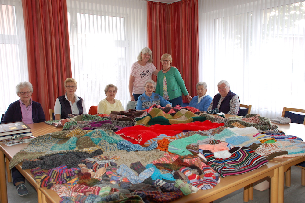 Bildunterschrift: Monika Lucht hatte zwei Fotoalben und viele Geschichten von ihrer Nepalreise im Gepäck. Maria Pundsack, Hildegard Gosewehr, Elfriede Triphan, Klara Johannpötter, Angela Meier, Hedwig Kreimer und Hedwig Pohlschmidt hatten im Gegenzug eine Auswahl ihrer Strickarbeiten ausgebreitet, die sich schon bald auf die Reise zum Kleinen Prinzen machen.