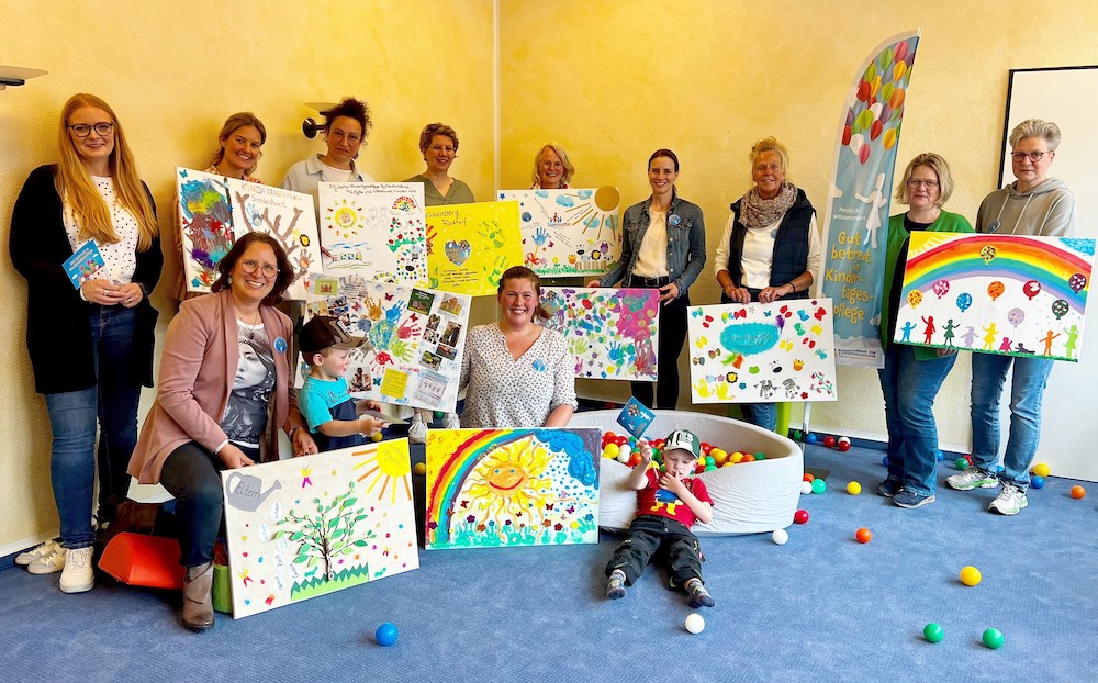 50 Jahre Kindertagespflege in Deutschland: dazu haben viele Tagespflegepersonen mit den Kindern bunte Leinwände gestaltet. Sie sind im Warendorfer Haus der Familie zu bestaunen. Im Bild: hinten v.l.: Natascha Schröder, Carina Bertels (beide Amt für Jugend und Bildung), Asli Nalbantlar Genc (Kindertagespflegeperson), Meike Zandbergen (AWO), Rita Schlingmann (Kindertagespflegeperson), Nina Bisping (AWO), Christiane Wiesmann, Anne Borgmann-Burbank, Susann Pohl (alle Kindertagespflegepersonen), vorne v.l.: Isabella Matic (Haus der Familie), Sandra Dollmann (Kindertagespflegeperson).