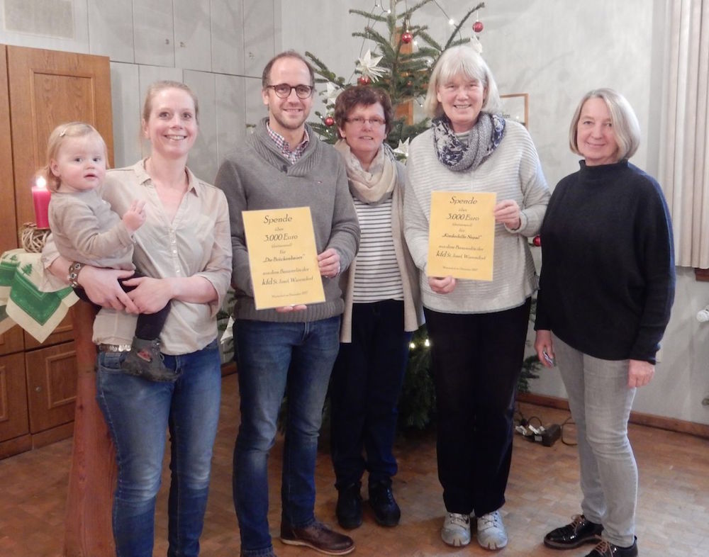 Am Montag, den 11.12.17 hatte die Teamsprecherin der kfd St. Josef, Marianne Maßmann, die angenehme Aufgabe, den Erlös in Höhe von 6000,- € an zwei Vereine zu übergeben. Viel Beifall erntete sie, als sie bekannt gab, dass jeder Verein mit 3000,- € bedacht wird. So wurde ein symbolischer Scheck an Frank Hankemann für den Verein „Die Brückenbauer“ (Pater Tom) und an Monika Lucht für die „Kinderhilfe Nepal“ übergeben.