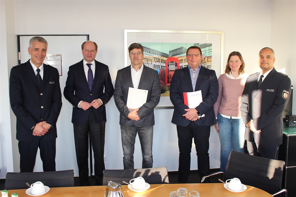 v.l. PHK Marin Entrup, Landrat Dr. Olaf Gericke, KHK Berthold Sager, RBr Thomas Wiechers, Leiterin Dezernat ZA 1 2, Polizeidirektor Johannes Schütze.