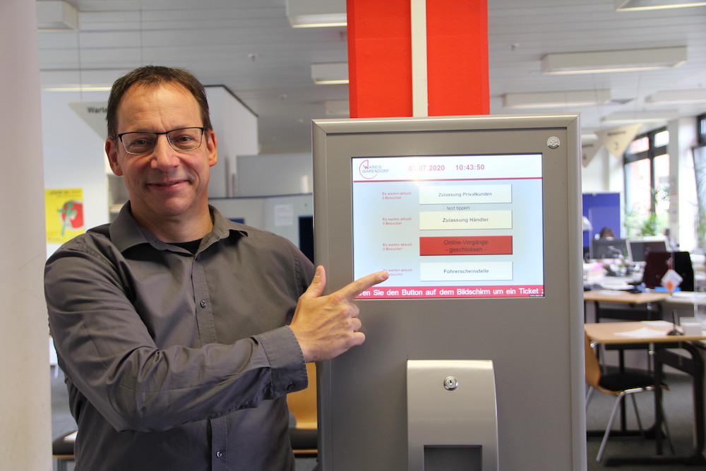 Sascha Kortmann, Leiter der Zulassungsstelle in Warendorf, macht darauf aufmerksam, dass spontane Besuche ab kommenden Montag wieder möglich sind. Mitarbeiter der Zulassungsstelle werden die Wartemarken ausgeben. – Foto: Kreis Warendorf