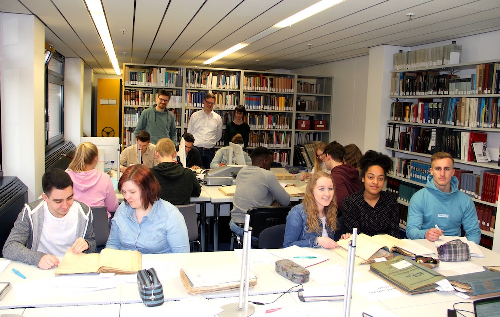 Der Geschichts-Leistungskurs der Jahrgangsstufe 12 des Augustin-Wibbelt-Gymnasiums Warendorf besuchte mit Lehrer Thomas Schönherr (l.) das Kreisarchiv. Dessen Leiter Dr. Knut Langewand und Mitarbeiterin Andrea Gawlytta halfen den bei der Suche nach interessanten Quellen.