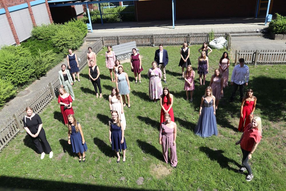 Die stellvertretende Schulleiterin Inka Schweers hatte zu Beginn der Verabschiedung ein Grußwort des Schulleiters Udo Lakemper übermittelt, der an diesem Tag privat in Abiturfeierlichkeiten eingebunden war. Er ließ seine Glückwünsche an einen ganz besonderen Abiturjahrgang ausrichten, der trotz aller Corona-Einschränkungen jetzt ein vollwertiges Zentralabiturzeugnis in den Händen halte. Die bereits vorhandenen Fähigkeiten der Schülerinnen und Schüler, mit Internet, Smartphone, PC und sozialen Netzwerken umgehen zu können, seien eine wichtige Basis gewesen für die erforderliche „radikale und rasante Umstellung auf das Distanzlernen“. Udo Lakemper bescheinigte den Absolventinnen und Absolventen außerdem eine große mentale und physische Stärke, die in den letzten drei Jahren geholfen haben müsse, das Bildungsziel zu erreichen: „Meinen Respekt dafür, eine 5-stündige Leistungskursklausur mit einer FFP2-Maske zu schreiben.“ Inka Schweers schloss sich dieser Einschätzung an und sah im Durchhaltevermögen der jungen Frauen und Männer eine gut ausgebildete Kompetenz, trotz aller Widrigkeiten und Krisen physisch und mental in Form zu bleiben und hoffentlich positiv in die Zukunft nach Corona blicken zu können.