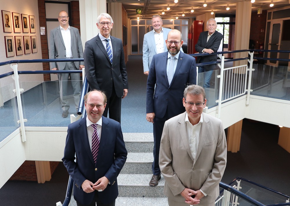 Trafen sich zum Planungs- und Lenkungsausschuss des Glasfaserausbaus in den Außenbereichen (v.l.): Bürgermeister Carsten Grawunder, Landrat Dr. Olaf Gericke, Bürgermeister Karl-Friedrich Knop, Bürgermeister Wolfgang Annen, Planungsdezernent Dr. Herbert Bleicher, Geschäftsführer Deutsche Glasfaser Dr. Stephan Zimmermann und Lutz Henke von der Stadt Ahlen. – Foto: Kreis Warendorf