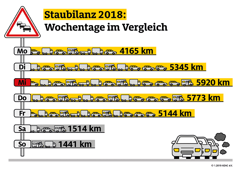 Staureichster Monat war bundesweit der Juni (186.534 Staus), in NRW der November (56.652 Staus). Als Wochentag mit den meistens Staus bundesweit löste der Mittwoch (5920 Kilometer im Schnitt) den Donnerstag ab (5773 Kilometer). Die wenigsten Staus gab es traditionell sonntags (1441 Kilometer). Im Tagesverlauf traten vor allem zwischen 7 und 9 Uhr morgens sowie zwischen 15 und 18 Uhr nachmittags die meisten Staus auf.