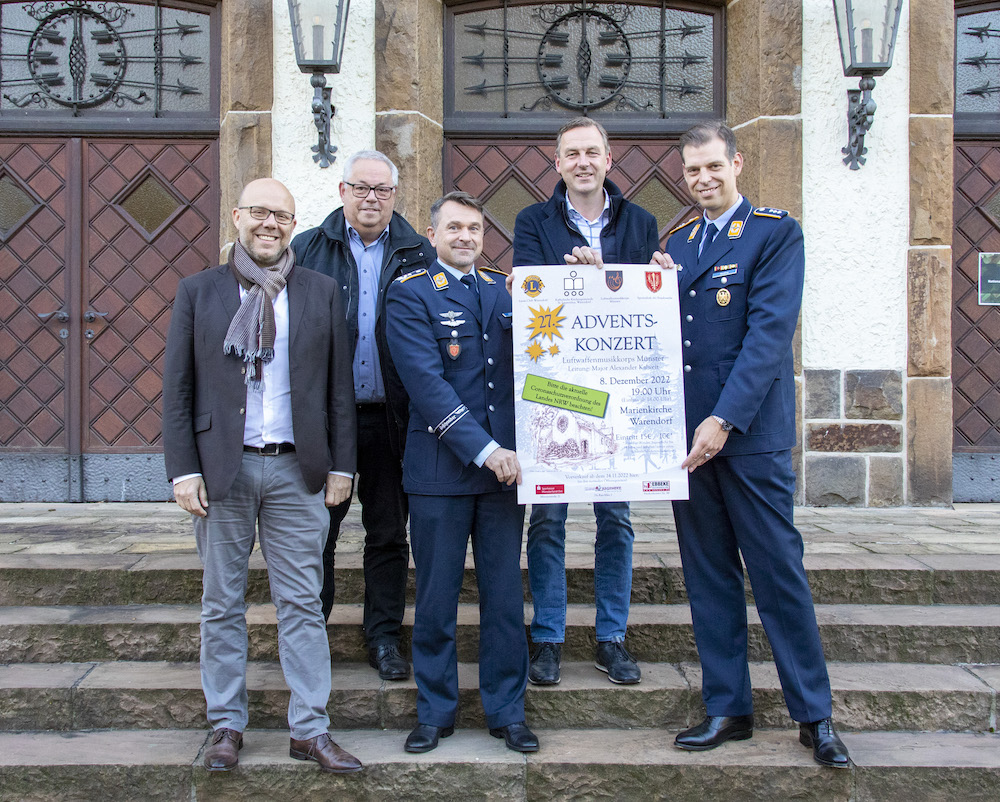 In diesem Jahr soll es klappen: Nach zwei schmerzhaften Absagen wollen das Luftwaffenmusikkorps Münster, der Lions-Club Warendorf, die Kirchengemeinde St. Laurentius und die Sportschule der Bundeswehr wieder das traditionelle Adventskonzert durchführen. Das 27. Adventskonzert findet am 8. Dezember 2022 ab 19 Uhr in der Marienkirche in Warendorf statt. „Das ist eine Veranstaltung, die an die Herzen der Menschen appelliert“, betonte Oberst Rüdiger Jorasch bei der Vorstellung der Konzertplanungen in der Sportschule der Bundeswehr. Zum einen führe es Menschen aus der Gemeinde zusammen und stimme auf Weihnachten ein, zum anderen sei es eine Wohltätigkeitsveranstaltung. Denn auch dieses Mal sollen die Konzerterlöse für die sozialen Projekte „Klasse 2000“ und „Lions Quest“ des Lions-Clubs, die Ferienfreizeiten der katholischen Kirchengemeinde St. Laurentius, die 2023 in Wenholthausen (St. Josef) und Ramsbeck (St. Laurentius) stattfinden werden, sowie die Aufgaben des Soldatenhilfswerks verwandt werden. Und so habe man sich auch bewusst entschieden, die zwei ausgefallenen Konzerte 2020 und 2021 dennoch mitzuzählen, weil auch an diesen Terminen durch Tombola und Verzicht auf die Erstattung des Eintrittspreises bereits verkaufter Karten Erlöse für die gute Sache erwirtschaftet worden waren, betonte Oberst Jorasch. „Ich freue mich, dass das Konzert wieder stattfinden wird“, unterstreicht Lions-Präsident Prof. Dr. Dirk Domagk, zeige es doch auch die Verbundenheit der Gesellschaft. Und selbstverständlich wolle man nach Konzertende auch wieder zu Glühwein, Kinderpunsch und von den Lions-Damen selbstgebackenen Keksen ins Pfarrheim einladen, blickt der Präsident voraus. Davor allerdings wird die Musik im Mittelpunkt stehen. Einen Vorgeschmack darauf gab gestern Hauptmann Roman Reckling, der für das vom neuen Musikkorps-Leiter Major Alexander Kalweit zusammengestellte Konzertprogramm unter anderem einen symphonischen Teil, ein Intermezzo mit einem Tiefblech-Ensemble und natürlich auch adventliche Melodien ankündigte. „Die Vorfreude auf das Adventskonzert ist groß“, unterstreicht Lions-Konzert-Beauftragter Stefan Meimann und auch Kreis Dechant Peter Lenfers hofft auf ein stimmungsvolles Konzert: „Wir stellen die Kirche gerne zur Verfügung.“ Zunächst werden 300 Karten zum Preis von 15 Euro (ermäßigt 10 Euro) ab dem 14. November bei der Adler Apotheke, der Sparkasse an der Münsterstraße und bei der Buchhandlung Ebbeke in den Vorverkauf gehen. Wenn es die Corona- Lage zulässt, werden zusätzliche Karten an der Abendkasse angeboten, um die volle Kapazität der Marienkirche auszuschöpfen. Ein besonderer Dank geht an die Familie Buller, die dieses Event seit über 20 Jahren unterstützt hat und nun im wohlverdienten Ruhestand ist.