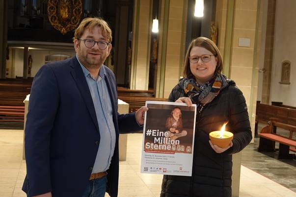 Philipp Langenkämper (Pfarrei St. Johannes Oelde) und Kathrin Wiggering (Fachbereich Gemeindecaritas Kreiscaritasverband) laden am 25. November 2023 zur Aktion #EineMillionSterne ein (Bild: Julia Kuhn).