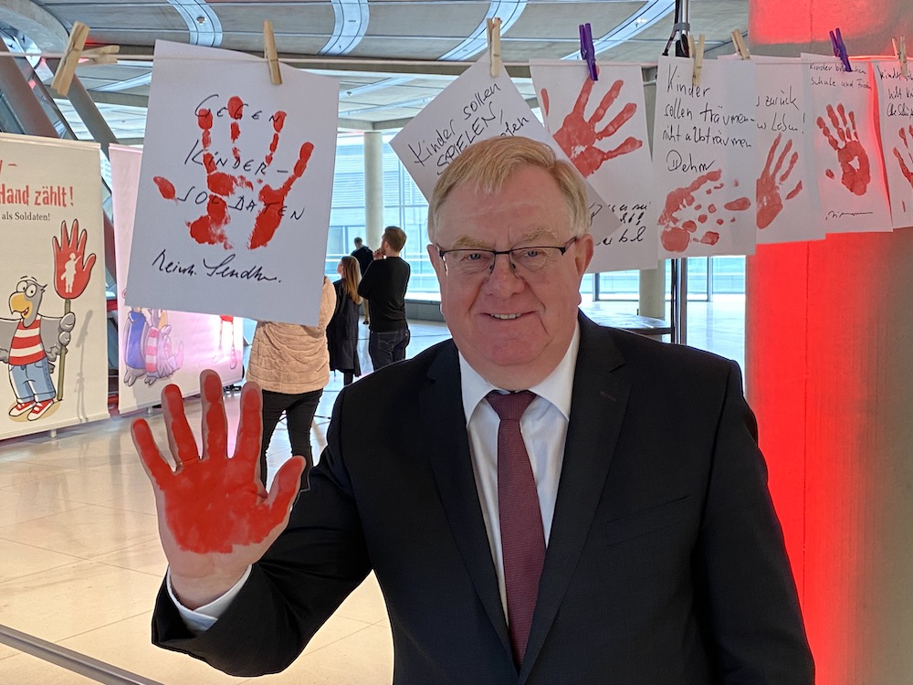 Berlin. Mit einem roten Handabdruck drückte der heimische Bundestagsabgeordnete Reinhold Sendker (Westkirchen) auch in diesem Jahr sein klares „Nein“ zur Rekrutierung und zum Einsatz von Kindersoldaten aus. Eingeladen hatte dazu zum wiederholten Male die Kinderkommission des Deutschen Bundestages, die mit einem eigenen Stand ein Zeichen gegen den Missbrauch von Kindern und Jugendlichen als Soldaten setzen wollte. Auf der Fraktionsebene des Reichstags konnten Abgeordnete und Beschäftigte des Deutschen Bundestages ihre Handabdrücke abgeben und damit gegen den Einsatz von Kindersoldaten protestieren. Gerade im Hinblick auf die vielen jungen Geflüchteten aus Bürgerkriegsländern mit entsprechenden Erfahrungen sei es Sendker ein besonderes Anliegen, hier im wahrsten Sinne des Wortes „Farbe“ zu bekennen, bemerkte der Bundestagsabgeordnete am Rande der Veranstaltung. Es sei eine besonders „widerwärtige und perfide Form des Kindesmissbrauchs“, Kinder gleichzeitig zu Tätern und Opfern zu machen. Geschätzt 250.000 Kinder seien davon weltweit betroffen. „Eine halbe Million Kinder, die für Kämpfe und Kriege ihrer Kindheit beraubt wurden. 250.000 verlorene Kinderseelen“, zeigt sich Sendker nachdenklich.