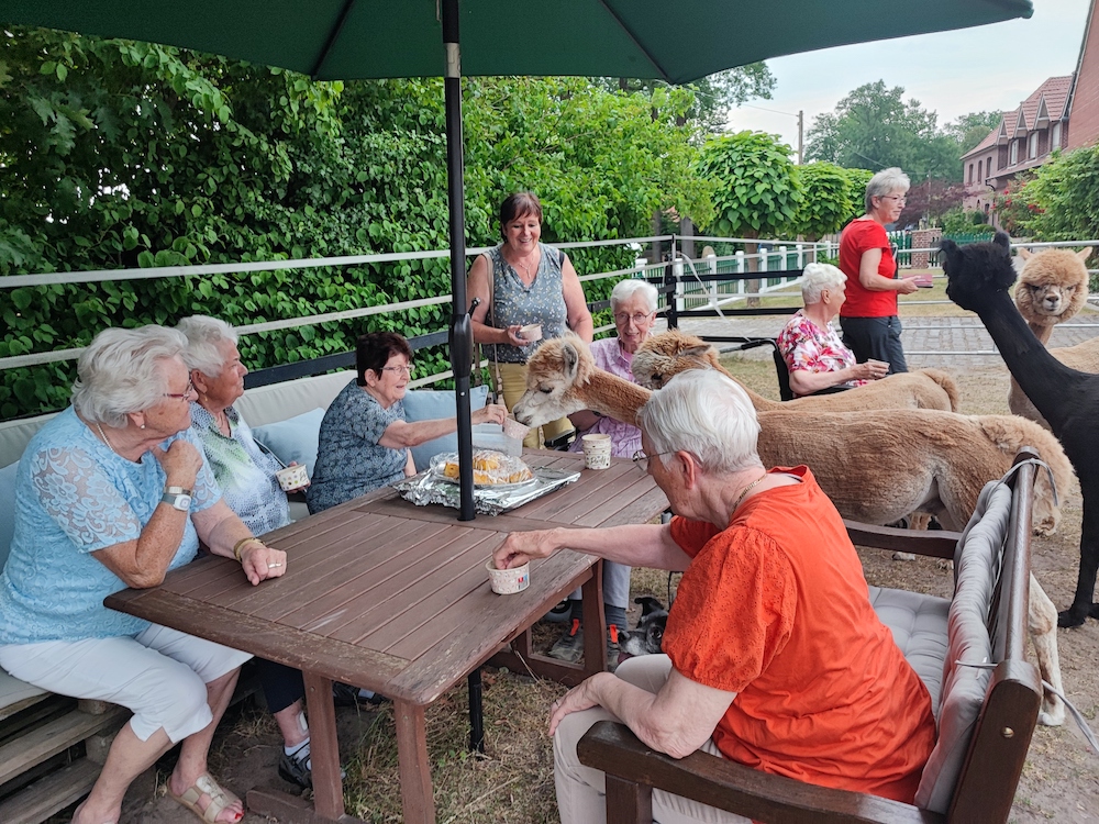 Am 22.06.2023 unternahmen die Senioren der Tagespflege Maria Tellen Füchtorf einen Ausflug zur Rippelbäumer Alpakabande. In der Wiese blieb nur ein kurzer Stopp, bis es anfing zu regnen. Charlie und Samson haben die Gäste aber gerne zum Kaffee und Kuchen in die Scheune begleitet. Es war für alle ein sehr schöner Nachmittag. (Foto: Tagespflege Maria Tellen)