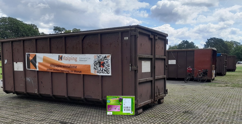 Auf dem Lohwall stehen an diesem letzten Samstag im Monat die von der Kolpingsfamilie Warendorf organisierten Altpapiercontainer bei der Abgabe von Kartonage und Altpapier bereit. Neu steht hier eine Sammelkiste für leere Tintenpatronen mit Druckkopf.
