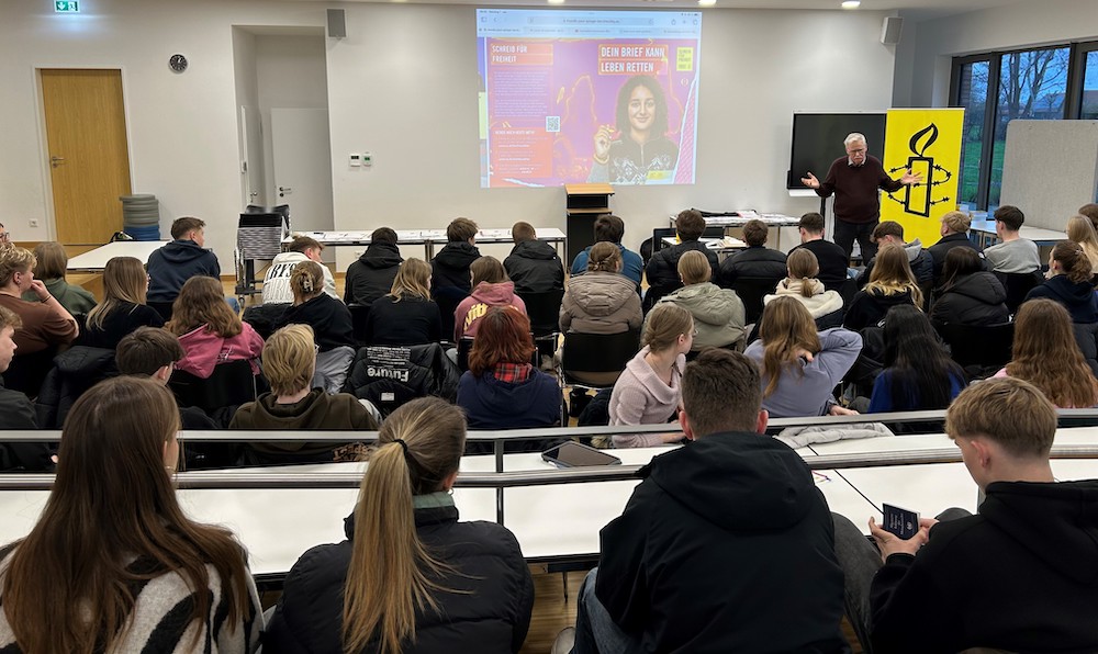 Konrad Schoppmann von der Warendorfer Gruppe Amnesty International führte die Briefaktion am Paul-Spiegel-Berufskolleg durch