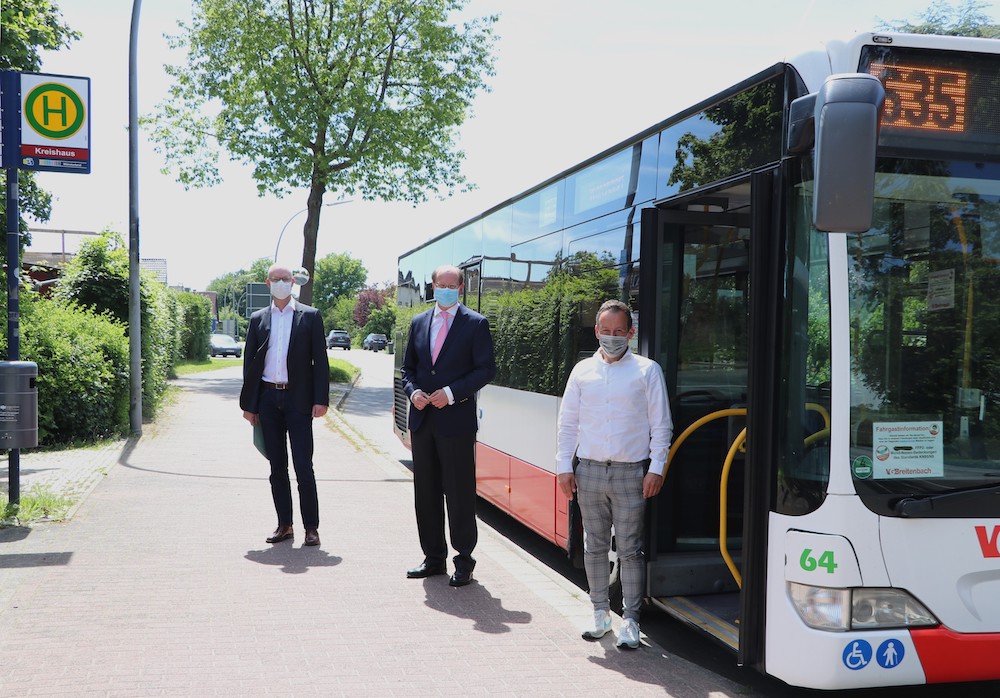 Martin Terwey (Leiter des Amtes für Planung und Naturschutz), Landrat Dr. Olaf Gericke und Nikolai Weber (Geschäftsführer Verkehrsgesellschaft Breitenbach; v.l.) freuen sich über die zusätzlichen Fahrten zwischen Warendorf und Ahlen. – Foto: Kreis Warendorf