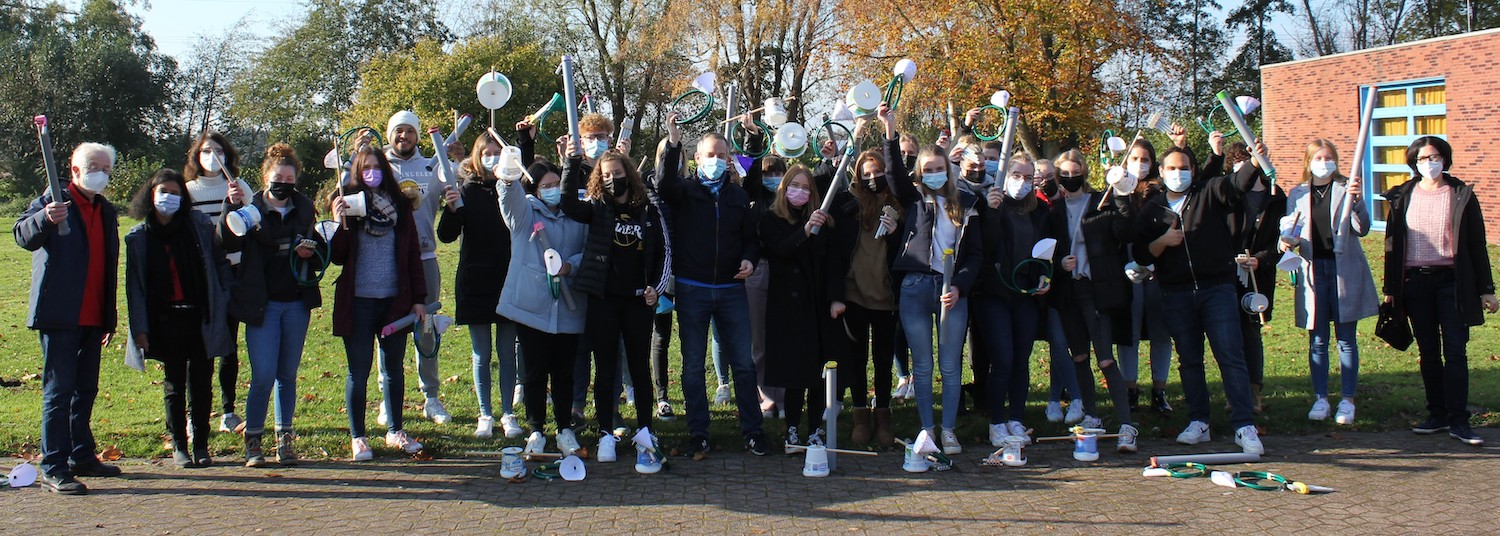 Die Studierenden durften sich als Klangforscher und Instrumentenbauer erproben und Musikinstrumente aus Alltagsgegenständen bauen. Am Ende des Projekttages konnten sich Panflöte und Joghurteimer-Gitarre, Wasserrohrfagott und Gartenschlauchtrompete oder eine Nagelbrettrührtrommel hören lassen. Unterstützt wurden sie dabei von zwei Fachleuten der „Mobilen Musikwerkstatt Münsterland“. „Ein Instrumentenbautag ist sicherlich auch ein tolles Projekt für die Praxiseinrichtungen der angehenden Erzieherinnen und Erzieher“, sind sich die Studierenden und ihre Lehrerin Sabine Klockenbusch als Organisatorin des Projektes einig.