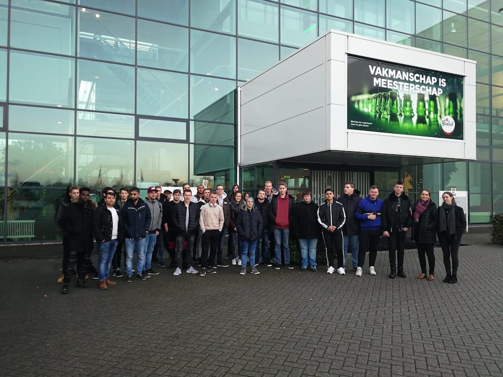 Die Auszubildenden für Lagerlogistik mit ihren Lehrerinnen Julia Sandknop und Tanja Drabe (1. u. 2. v.re.) vor der Grolsch Firmenzentrale (Enschede).