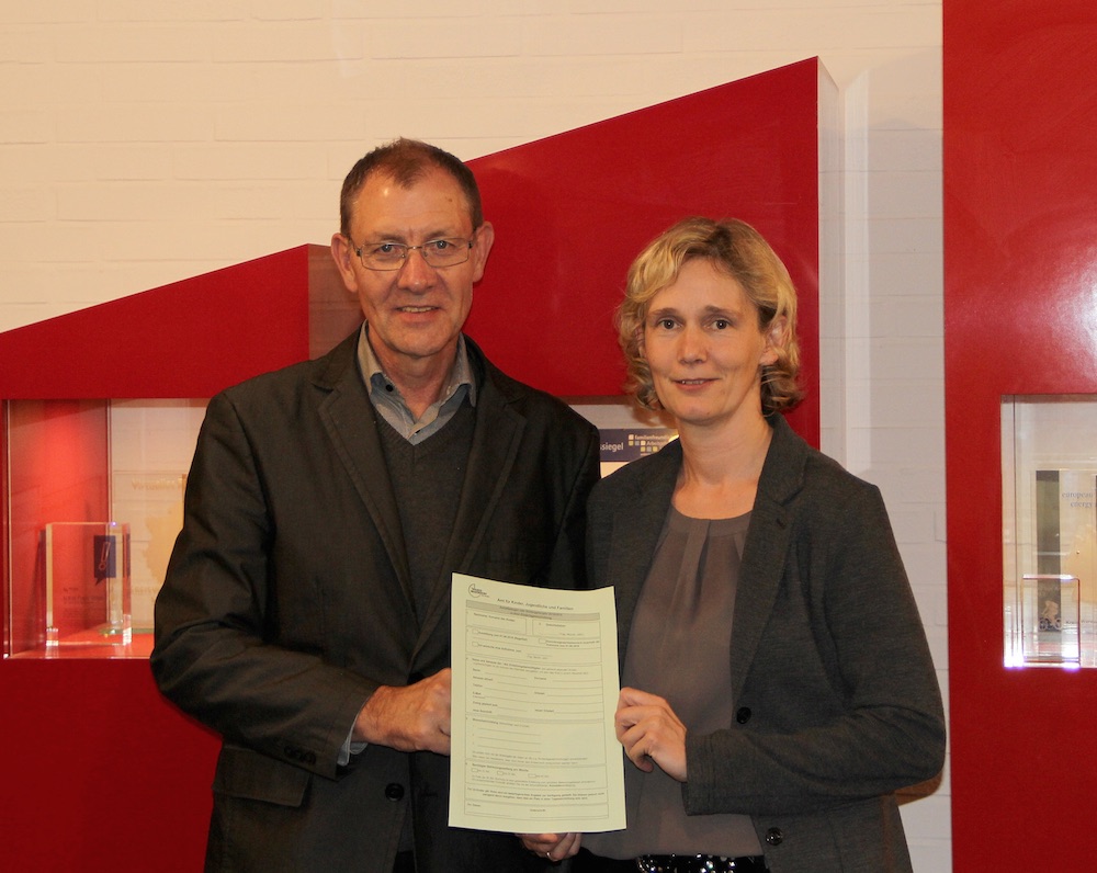 Am 30. Oktober beginnen die Anmeldewochen in den Kitas im Kreisjugendamtsbezirk. Darauf weisen Wolfgang Rüting, Leiter des Amtes für Kinder, Jugendliche und Familien des Kreises Warendorf, und Sandra Brinkmann, Vorsitzende des Kreiselternrats hin. – (Foto: Kreis Warendorf).