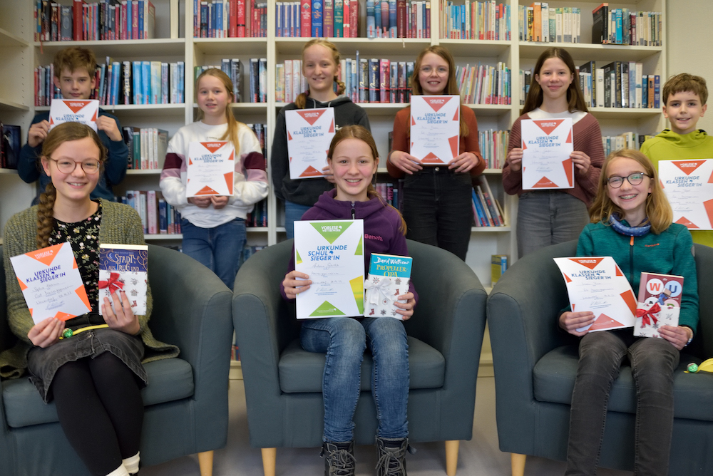 Inka Coppenrath und Imke Schmidt, die Koordinatorinnen des Wettbewerbs, hatten aus Anlass des Nikolaustages für eine festliche Stimmung gesorgt. So bekamen alle lesebegeisterten Schülerinnen und Schüler nicht nur Urkunden, sondern auch Schokolade. Die Warendorfer Buchhandlung Ebbeke und der Förderverein des Mariengymnasiums unterstützten drei Buchgeschenke, die zusätzlich an die drei Erstplatzierten überreicht wurden.