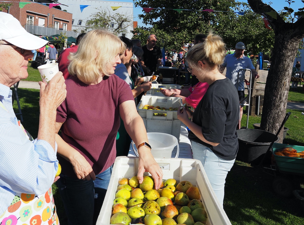 Auch kulinarisch hat das Fest einiges zu bieten: Neben Kaffee und Kuchen, Muffins und Brezeln sorgen vor allem die legendären Reibeplätzchen der Landfrauen mit Apfelmus für Begeisterung. Frisch gepresster Apfelsaft direkt von der Streuobstwiese – hergestellt von der Streuobstwiesen-Nachbarschaft – rundet das regionale Angebot ab.