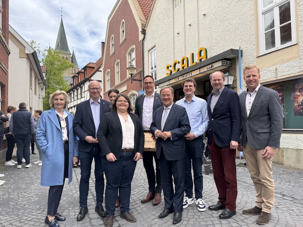 Freuten sich darüber, dass die Veranstaltung auf so große Resonanz stieß (v.l.): Warendorfs stellvertretende Bürgermeisterin Doris Kaiser, Daniel Hagemeyer MdL, die stellvertretende CDU-Kreisvorsitzende Katrin Schulze Zurmussen, CDU-Stadtverbandsvorsitzende Marija Ruzhitskaya, Kreisvorsitzender Markus Höner MdL, Armin Laschet MdB, Kinobetreiber Johannes Austermann, Landrat Olaf Gericke sowie Henning Rehbaum MdB.