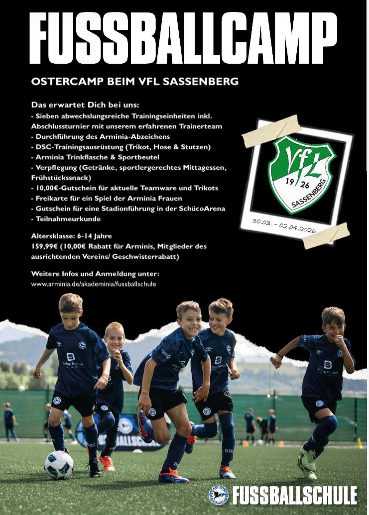 Nach dem erfolgreichen Fußballcamp in diesem Jahr, kommt die Arminia Fußballschule in den Osterferien vom 30. März bis zum 02. April 2026 wieder zum VfL Sassenberg.