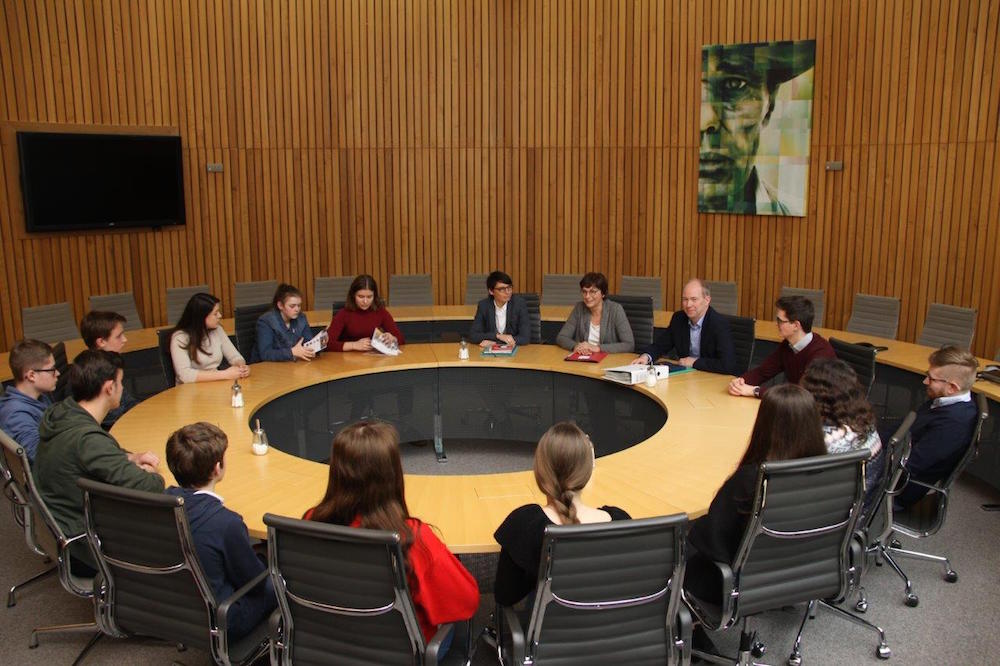 Zum Abschluss dieser interessanten und lehrreichen Zeit machten sich die elf Jungpolitiker in der vergangenen Woche gemeinsam mit einigen Mentoren der beteiligten Fraktionen auf den Weg zum Landtag in Düsseldorf, um dort einen Einblick in die politischen Prozesse auf Landesebene zu erhalten. Nach einem ausführlichen Informationsprogramm im großen Plenarsaal, in dem neben der Architektur des Gebäudes, der Sitzordnung im Parlament und dem Verfahrensgang eines Landesgesetzes auch die Frage erörtert wurde, warum der Sitzungssaal während der Plenarsitzungen häufig nur von wenigen Abgeordneten besetzt ist und wie man eigentlich Landtagsabgeordneter werden kann, nahmen sich gleich drei Abgeordnete aus den verschiedenen Fraktionen Zeit für die Schülergruppe und berichteten persönlich aus ihrer Arbeit im Landtag und im Wahlkreis. Annette Watermann-Krass von der SPD, Daniel Hagemeier von der CDU und Josefine Paul von den Grünen beantworteten ausführlich die Fragen der Jugendlichen und ermutigten sie abschließend selbst aktiv ihr Umfeld mitzugestalten, beispielsweise in der Schülervertretung.