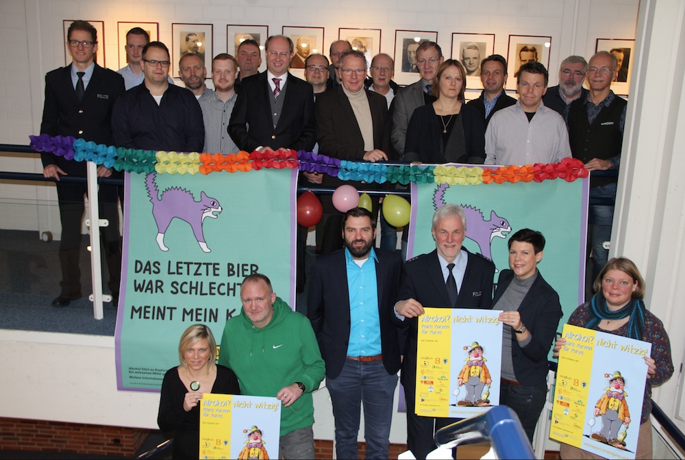 Spaß an Karneval – aber ohne Alkohol: Den Startschuss zur kreisweiten Kampagne „Alkohol? Nicht witzig! Keine Kurzen für Kurze!“ gaben Landrat Dr. Olaf Gericke (oben, 7.v.l.), Polizeidirektor Christoph Ingenohl (unten, 3.v.r.), Bürgermeister der Stadt Ennigerloh Berthold Lülf (oben, 8.v.r.), Jugendamtsleiter Wolfgang Rüting (oben, 6.v.r.) sowie Jugendamtsmitarbeiterin Katrin Diekhoff (unten, 2.v.r.). Mit dabei waren auch Vertreter der Ordnungsämter sowie der Jugendämter Ahlen, Beckum, Oelde und Warendorf.