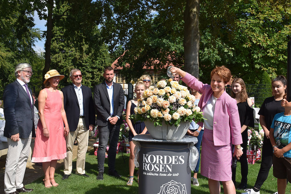 Vor rund 120 Festgästen taufte am Samstag, 18. August, Ulrike Burghardt, Vorsitzende der Bürgerstiftung Osnabrück (Projekt KidCourage) eine Neuzüchtung der Rosenschule Kordes’ Söhne auf den Namen ‚Courage’. „Wir möchten mit dieser Rose Zivilcourage in die Zukunft tragen, möge sie uns daran erinnern, dass es Wichtigeres gibt als die Angst“, mahnte Burghardt, die von sieben jungen Leuten begleitet wurde, allesamt Preisträger von KidCourage.