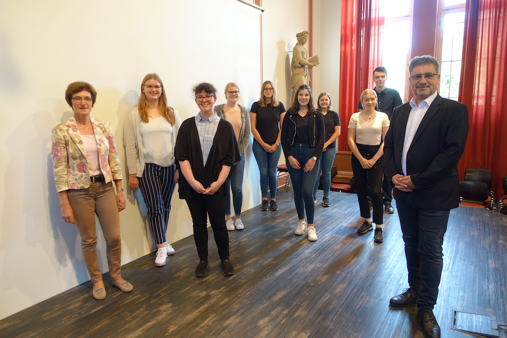 Das Bild zeigt die neuen Auszubildenden und Praktikantinnen, v.l. Angelika Köster (Ausbildungsleiterin), Marlen Koch, Sina Leuchtmann, Carla Büscher, Lisa Wiggering, Isabell Zustraßen, Anne Katrin Kemper, Malin Kujawski, Stephan Nordbeck und Bürgermeister Axel Linke. (Foto: Stadt Warendorf)