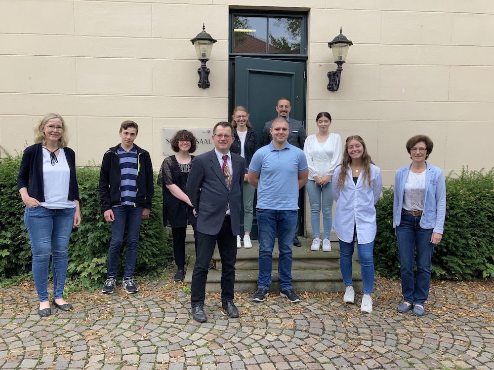 (v.l.) Silke Middendorf (Sachgebietsleitung Innere Verwaltung, Stadt Warendorf), Felix Kinder (Ausbildung Gärtner, Fachrichtung Friedhofsgärtnerei), Sina Leuchtmann (Praxisintegrierte Ausbildung zur Erzieherin), Baudezernent Peter Pesch, Anna Thüsing (Bachelor of Laws), René Remkamp (Ausbildung Verwaltungsfachangestellter), Raphael Klingenhäger (Bachelor of Laws), Aleyna Koctar (Ausbildung Verwaltungsfachangestellte), Alara Mekic (Bachelor of Arts), Angelika Köster (Ausbildungsbeauftragte, Stadt Warendorf)