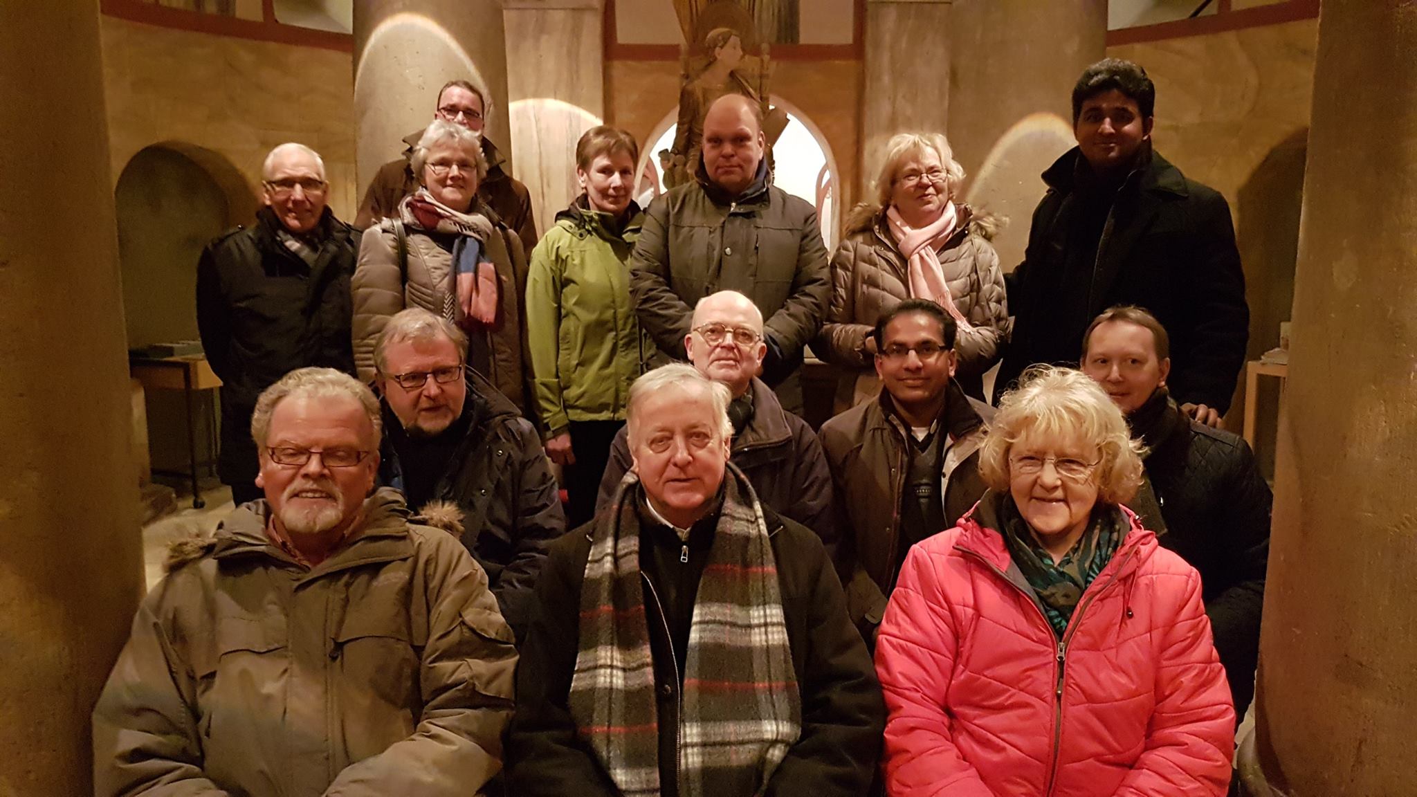 Nach der Ankunft in Rheine, einem Spaziergang durch die historische Innenstadt und dem Besuch des ältesten Bauwerkes der Stadt, der spätgotischen Kath. Stadtkirche St. Dionysius, in mehreren Bauabschnitten nach über 120 Jahren 1520 fertiggestellt, in welcher der ehemalige Telgter Propst von St. Clemens, Heinrich Tietmeyer, seit seinem Eintritt in den Ruhestadt vor 12 Jahren seelsorgerische Dienste verrichtet, stand die Besichtigung der durch ihre Raumwirkung den Eindruck von römischen Katakomben vermittelnde Krypta unter dem Hochaltar der bekannten St. Antonius-Basilika mit einer Fläche von von mehr als 200 qm größten Kirchenkrippe Westfalens, welche seit mehr als 35 Jahren von dem ehemaligen Sakristan der Basilika, Friedel Theismann und 2 weiteren Helfern mit großem Einsatz und viel Herzblut aufgebaut und gestaltet wird, auf dem Programm. Die Gelegenheit zum Besuch dieser weithin beachteten Krippe mit ihren vielfältigen und abwechslungsreichen biblischen Darstellungen wird von Besuchern aus dem gesamten westfälischen Raum genutzt. Der Krippenaufbau beginnt im November eines jeden Jahres – ab Hl. Abend kann die Krippe dann besichtigt werden. Die ältesten der über 100 verschiedenen Krippenfiguren stammen aus dem 19. Jahrhundert – durch Zukäufe wird der Bestand erweitert. Von den einzelnen biblischen Darstellungen waren die Teilnehmer von dem Blick auf die Silhouette Bethlehems mit den weißen Häuserfassaden, die im nächtlichen Sternenlicht scheinbar in sehr weiter Ferne am Horizont erscheint, in Wirklichkeit aber nur 20 Meter entfernt war, am meisten beeindruckt. Mit dem gemeinsamen Singen von Weihnachtsliedern zum Abschluss der Weihnachtlichen Festzeit endete die Führung durch die interessante und abwechslungsreiche Krippenlandschaft. Im Anschluss hieran bestand noch die Möglichkeit, zum Besuch des Pfarrarchivs der Basilika, in dem unter anderem eine große Anzahl von Kunstgegenständen und bildlichen Darstellungen der traditionsreichen Altenrheiner Fußwallfahrt nach Telgte zu besichtigen waren.