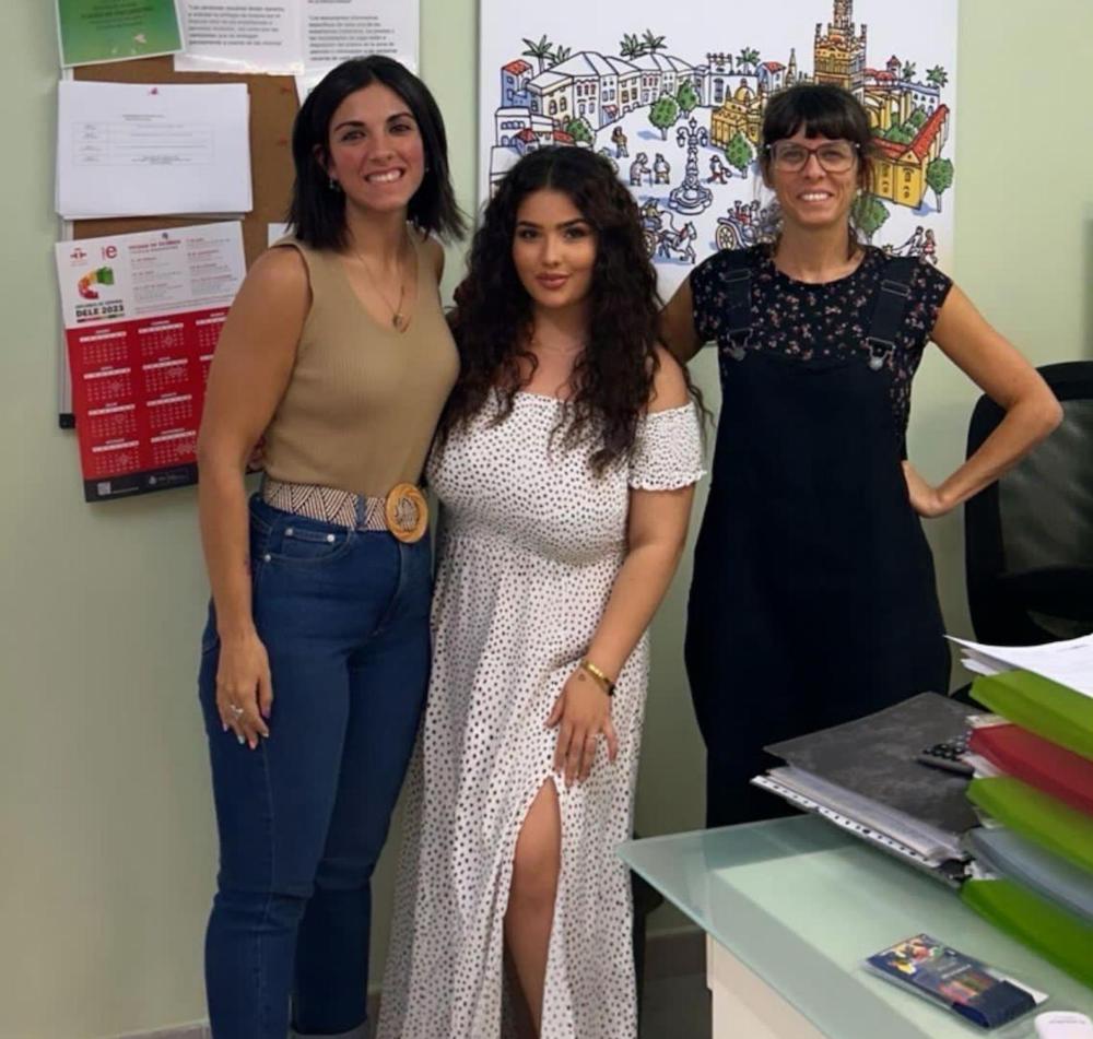 Selin Uslu (Höhere Berufsfachschule Wirtschaft und Verwaltung, Mitte) in ihrem Praktikumsbetrieb, der Sprachenschule „Sevilla habla“, mit Kolleginnen Mercedes Cuerda (li.) und Beatriz Dominguez (re.)