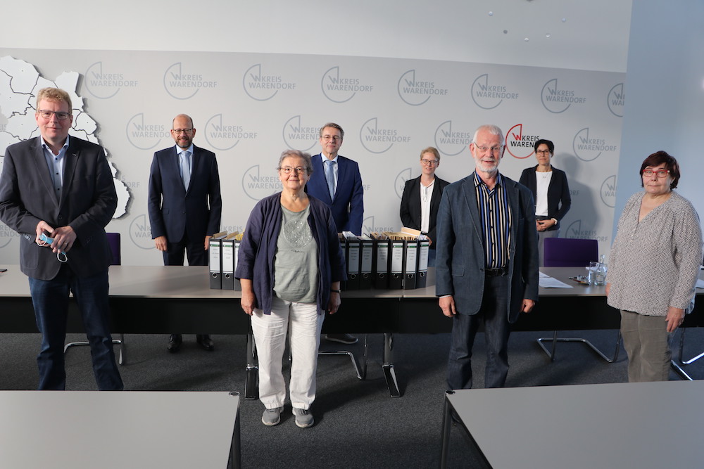 Der Wahlausschuss des Kreises Warendorf hat am Freitag im Kreishaus getagt und das vorläufige amtliche Endergebnis festgestellt. Das Bild zeigt (v. l.) Rolf Möllmann (CDU), den Stellvertretenden Kreiswahlleiter Dr. Herbert Bleicher, Ingrid Hohmann de Palma (Grüne), Kreiswahlleiter Dr. Stefan Funke, Kreiswahlsachbearbeiterin Nicole Rogoski, Detlef Ommen (SPD), Kreiswahlsachbearbeiterin Ilona Nordmeyer und Maria Hamann (SPD). Bild: Kreis Warendorf