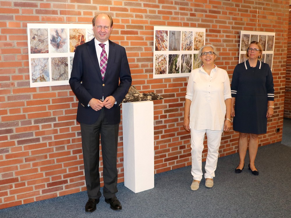 Landrat Dr. Olaf Gericke eröffnete die Ausstellung „Visibilis“ der Oelder Künstlerin Carmen Stock (Mitte) im Kreishaus. Melanie Becker-Hoffmann (r.), Geschäftsführerin des Kreiskunstvereins Beckum-Warendorf, stellte die Künstlerin vor. – Foto: Kreis Warendorf