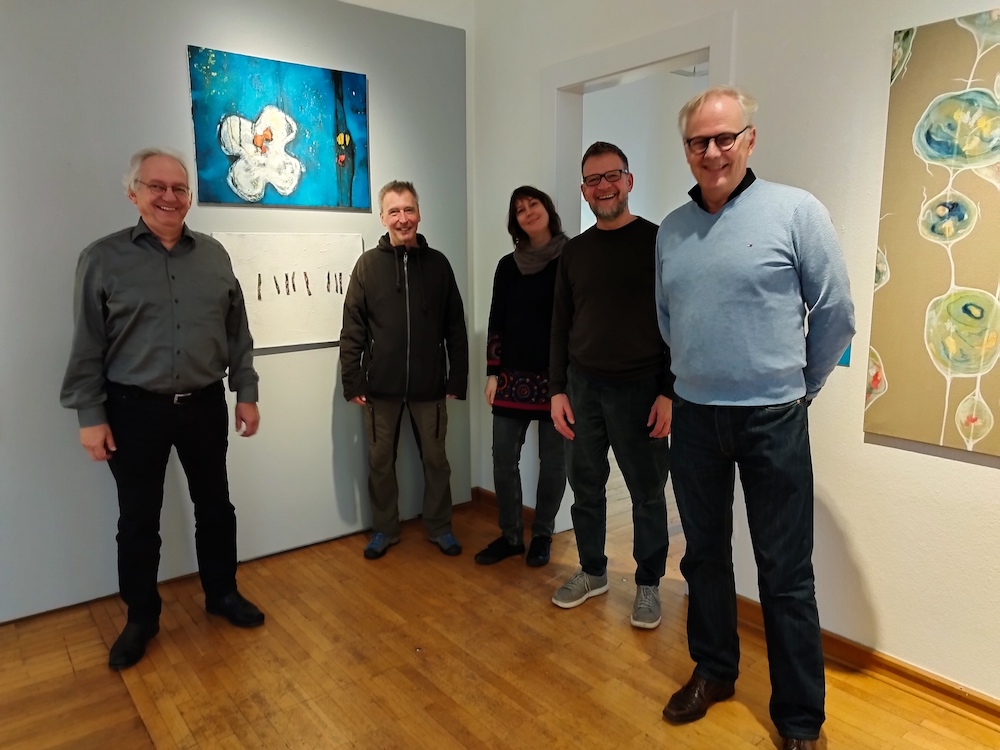 Momentaufnahme beim Ausstellungsaufbau: (v.l.n.r.) Manfred Kronenberg (Kunstkreis Warendorf), Michel M., Maria Allefeld, Meinhard Schulte und Wolfgang Türk (Kulturamt Warendorf).