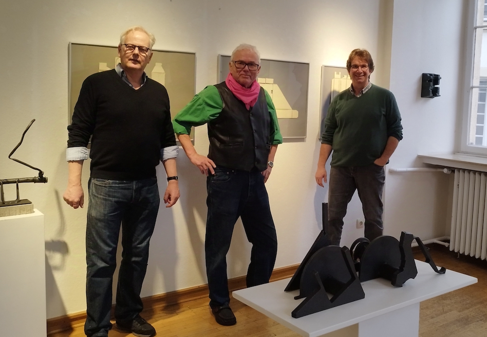 Beim Ausstellungsaufbau (v.l.n.r.): Kulturamtsleiter Wolfgang Türk, Künstler Peer Christian Stuwe, Museologe Alfred Smieszchala.