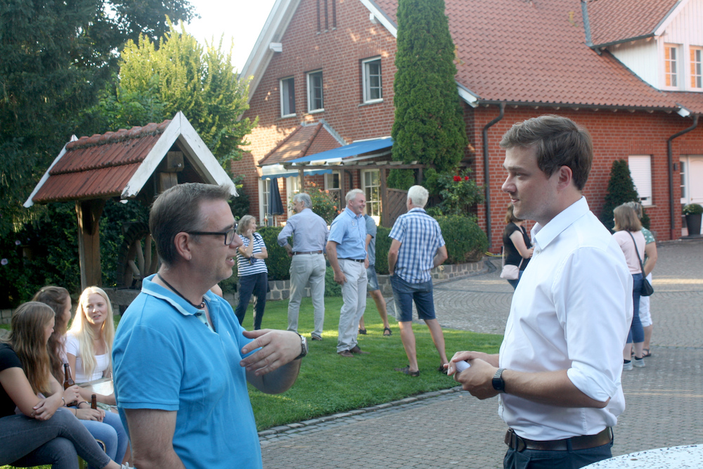 Bereits am Vormittag war Horstmann durch einen Stand am Getränkemarkt Holtkamp mit vielen Miltern ins Gespräch gekommen. Im Anschluss traf er sich mit den Gewerbetreibenden vor Ort, welche die aktuelle Unattraktivität Miltes als Industriestandort bemängelten. Wie der Bürgermeisterkandidat in seiner Ansprache am Abend darstellte, sei die Lage in Milte bei den Bauwilligen wie Gewerbetreibenden durch eine gewisse Perspektivlosigkeit gekennzeichnet. Grund hierfür sei vor allem die sich in die Länge ziehende Erschließung neuer Baugebiete. Horstmann plädierte für mehr Transparenz im Bauverfahren, wies jedoch auch auf eine ausgewogene Balance zwischen Substanzerhalt und Neubau von Wohnraum hin. Wichtig sind für ihn langfristige Planungen, die eine nachhaltige Entwicklung des Ortes gewährleisten. „Gerade Kindergarten und Schule sind wesentliche Standortsfaktoren für das Dorf, die erhalten werden müssen.“, betonte Horstmann. Ferner wies er auf die Wichtigkeit eines aktiven Vereinswesens und die Bedeutung der Gaststätte Biedendieck als dörflicher Begegnungsort hin. Auch zukunftsweisende Projekte, wie etwa der Mehrgenerationenhof oder das Haus Gedigk, ließ er nicht unerwähnt.