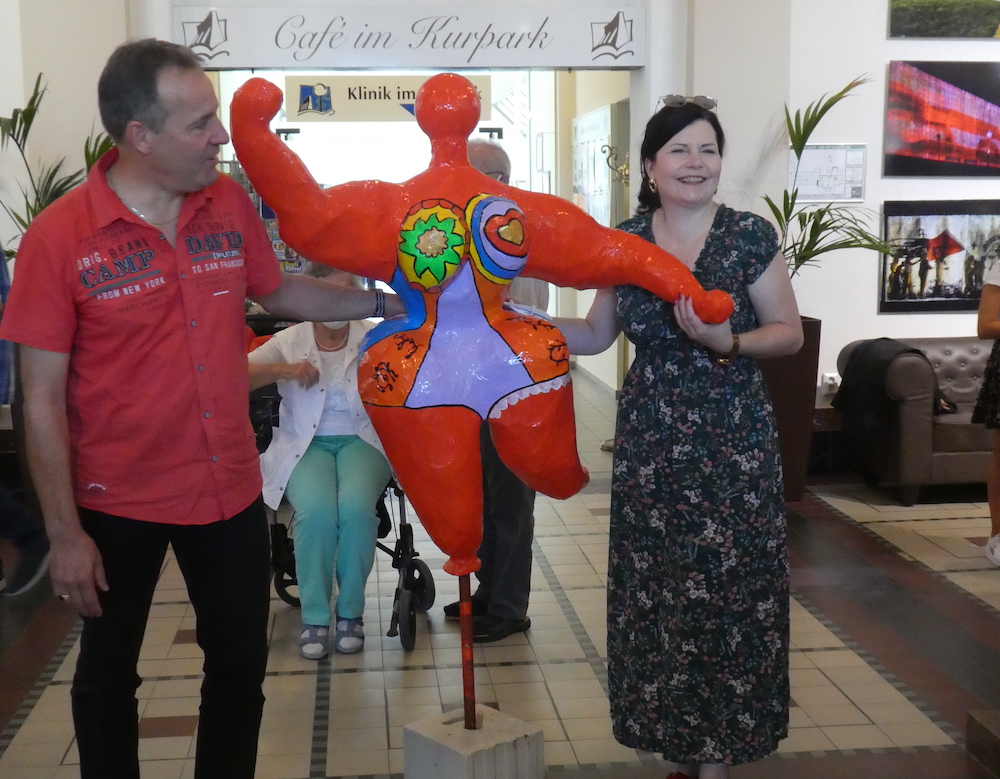 Die Versteigerung leitete Reinhard Diekmann und animierte in humorvoller Weise das Publikum zum Mitbieten. Zum Schluss des spannenden Bietergefechts ging die Nana an das Ehepaar Heidi und Thomas Bauer Vömel nach Bad Iburg und verschönt nun dort deren Garten. Durch die Auktion und den Verkauf der Kinderbilder kam bislang schon eine stolze Summe von über 1000 € zusammen. Die Ausstellung ist noch bis zum 30. Oktober während der Öffnungszeiten des Kurmittelhauses zu besichtigen. Weiterhin geht ein Teil des Verkaufserlöses der Bilder der großen und kleinen Künstler:innen an die Initiative „Wir für Dissener Kinder “.