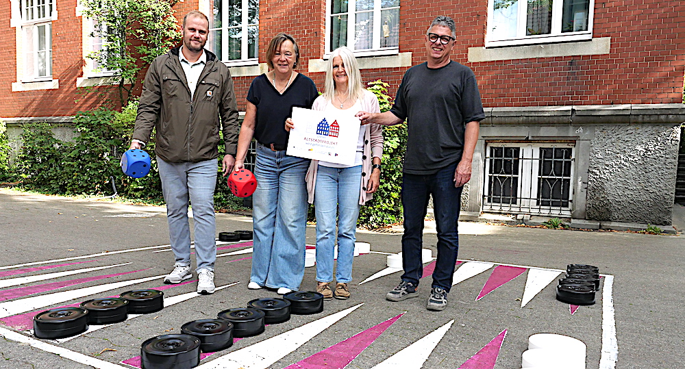 Mit einem neuen Outdoor Backgammonspiel (und später vielleicht noch anderen) soll die Spielfläche am „Zwischenraum“ neben dem Schulhof der ehemaligen Laurentiusschule anders belebt werden. Das Areal sei, bedingt durch die Nutzung der ehemaligen Schule zur Unterbringung von Geflüchteten, sehr einseitig geprägt, sagte Christiane Busmann, eine der ehrenamtlich Engagierten des Projekts Zwischenraum, bei der Vorstellung. Die Nachbarschaft fehle und die solle sich durch die Spielmöglichkeit gerne eingeladen fühlen.